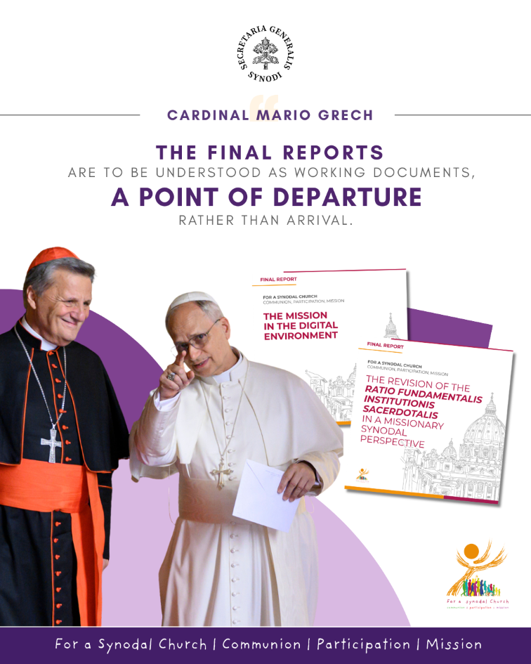 Văn phòng Tổng Thư ký Thượng Hội đồng hôm nay công bố hai Báo cáo Cuối cùng đầu tiên của các Nhóm Nghiên cứu do Đức Giáo Hoàng Phanxicô thành lập sau Phiên họp thứ nhất của Phiên họp thường lệ lần thứ XVI: đó là Báo cáo của Nhóm Nghiên cứu số 3 về Sứ mệnh trong môi trường kỹ thuật số và Báo cáo của Nhóm Nghiên cứu số 4 về việc xem xét lại văn kiện Ratio Fundamentalis Institutionis Sacerdotalis [Lý lẽ Cơ bản của Định chế Linh mục] trong viễn cảnh hiệp hành truyền giáo.