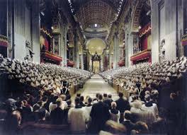 Sự kiện Công đồng Vatican II là một công đồng của những cái nhất xuất hiện rõ ràng hơn vào ngày 11 tháng 10 năm 1962, khi một số lượng lớn các giám mục - hai nghìn bốn trăm bốn mươi vị - diễn hành tiến vào Vương cung thánh đường Thánh Phêrô. Nếu Công đồng Vatican I, với khoảng 642 Nghị phụ, tìm đủ chỗ ngồi ở cánh phải của Vương cung thánh đường, thì giờ đây toàn bộ gian giữa đã được biến thành Phòng Họp Công Đồng. Trong khoảng cách một trăm năm giữa hai công đồng, Giáo hội, như giờ đây hiển hiện một cách hết sức ấn tượng, đã trở thành một Giáo hội phổ quát không những trên danh nghĩa mà còn trên thực tế nữa. Thực tại này nay được phản ảnh trong con số 2, 440 Nghị phụ và các quốc gia xuất xứ của họ. Ngoài ra, lần đầu tiên trong lịch sử, một công đồng có thể bỏ phiếu với sự trợ giúp của kỹ thuật điện tử, và các vấn đề về âm thanh (acoustical) từng làm phiền các vị tham gia Vatican I thậm chí không còn được đề cập đến nữa.