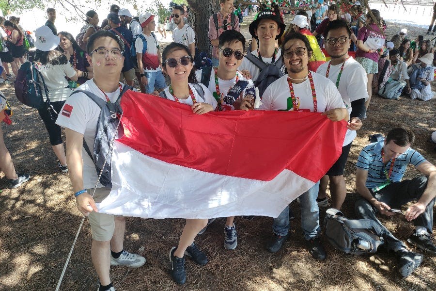 Những người hành hương Ngày Giới trẻ Thế giới cầm cờ Indonesia tại Lisbon, Bồ Đào Nha, vào ngày 1 tháng 8 năm 2023. (Ảnh: Filipe D’Avillez/Pillar Media)
