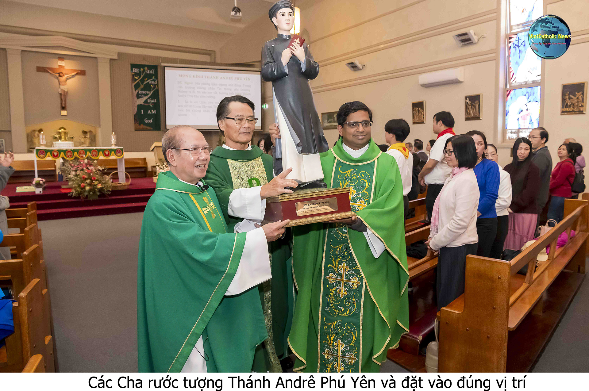 Sau cùng là phép lành kết thúc Thánh Lễ và nghi thức trang trọng An Vị Tượng Thánh Andrê Phú Yên vào vị trí đã được dọn sẵn. 4 cha cùng nâng tượng Thánh Andrê Phú Yên tới vị trí và đã An Vị Tượng Thánh Andrê Phú Yên, Bổn Mạng Giáo Đoàn ngay trong Nhà Thờ. Mọi người ra tham dự party thân mật cùng với quý cha và quan khách cùng chia sẻ niềm vui trong yêu thương…