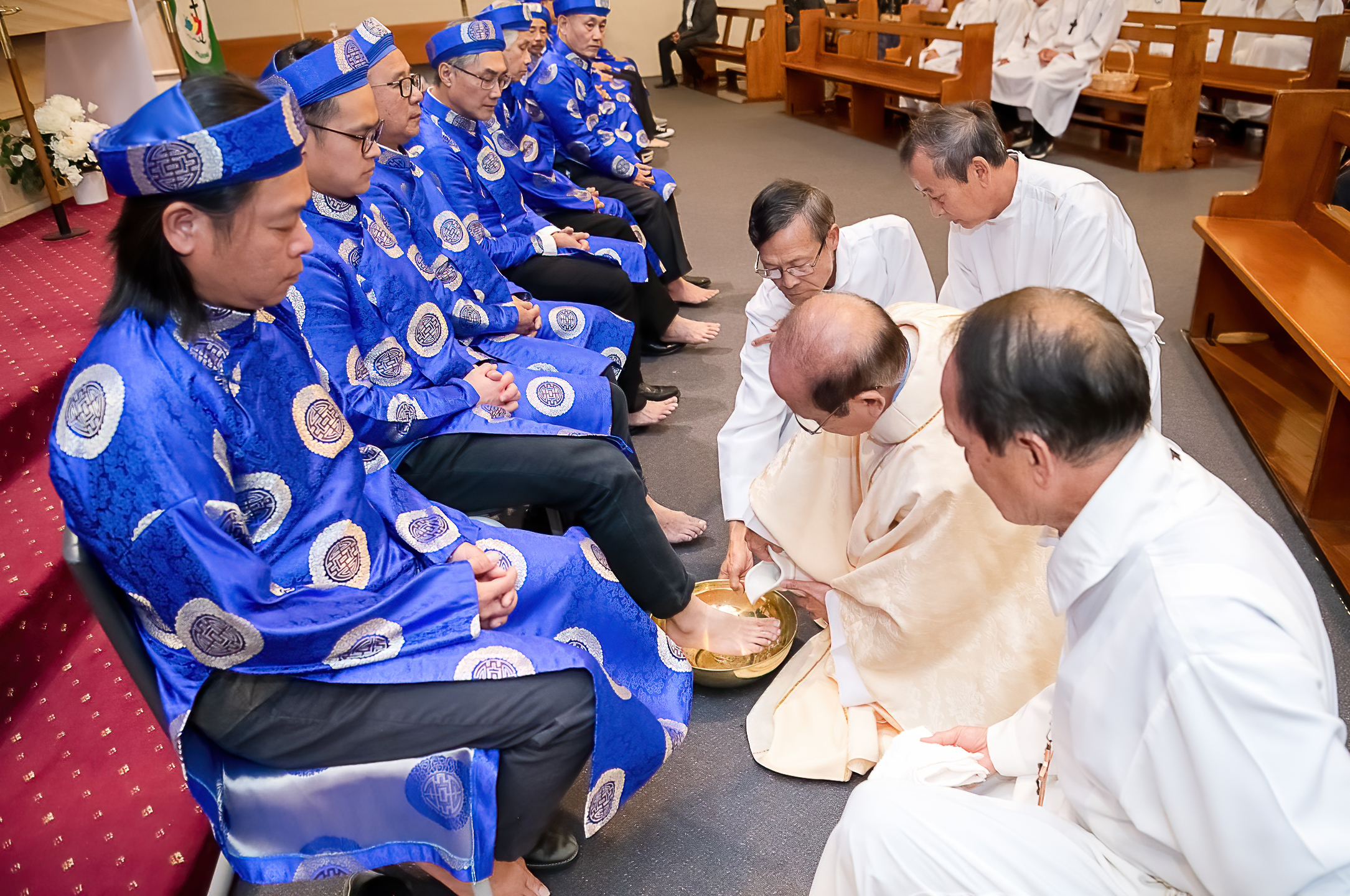 Phần đặc biệt hôm nay là ghi thức rửa chân, 12 vị Tông Đồ đại diện cho Giáo đoàn lên ngồi trên bậc cung thánh, và cha đi từng người rửa chân cho họ, lau bàn chân và hôn lên, như một cử chỉ yêu thương con người mà Chúa Giêsu xưa đã làm cho các môn đệ của ngài, trước khi bị chết trên thập giá.