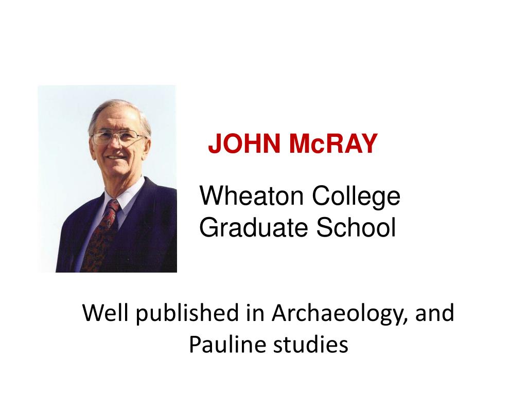 Khi các học giả và sinh viên nghiên cứu khoa khảo cổ, nhiều người phải nhờ cuốn sách giáo khoa thấu đáo và vô tư dầy 432 trang của John Mcray tựa là Archeology and the New Testament (Khảo cổ học và Tân Ước). Khi Mạng Lưới Truyền Hình Nghệ thuật và Tiêu khiển muốn bảo đảm tính chính xác của chương trình Mysteries of the Bible (Các Mầu nhiệm của Kinh Thánh), họ cũng gọi cho Mcray. Và khi National Geographic cần một nhà khoa học có thể giải thích được các tế vi của thế giới Kinh Thánh, một lần nữa, điện thoại tại văn phòng của Mcray tại Cao đẳng Wheaton danh tiếng ở ngoại ô Chicago lại reo vang.