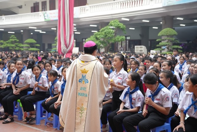 Trước khi kết thúc bài chia sẻ, những lời nhắn nhủ của Đức cha cho các bạn em thiếu nhi được gói gọn trong lời bài hát “Của lễ con dâng” của nhạc sĩ Phạm Quang.