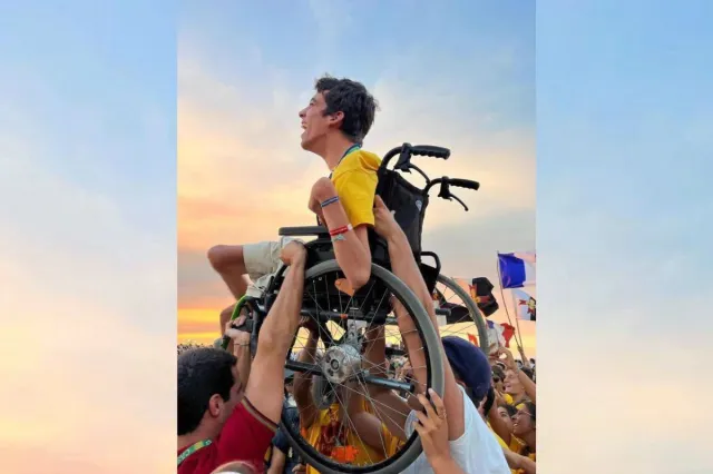 Hình ảnh đẹp đáng nhớ của Đại Hội Giới trẻ Thế giới 2023: Những người bạn nâng một thanh niên ngồi trên xe lăn lên nắm bắt được ý nghĩa của Giáo hội.