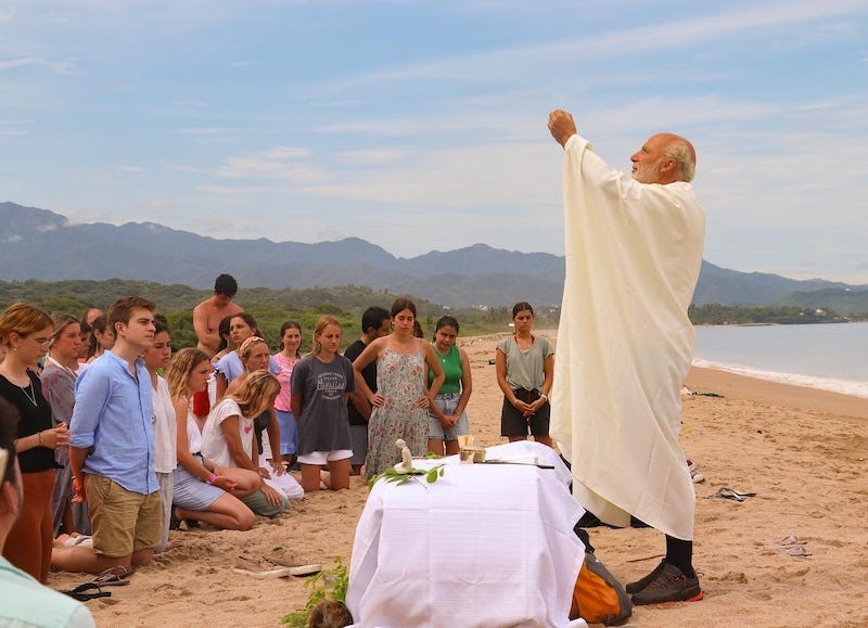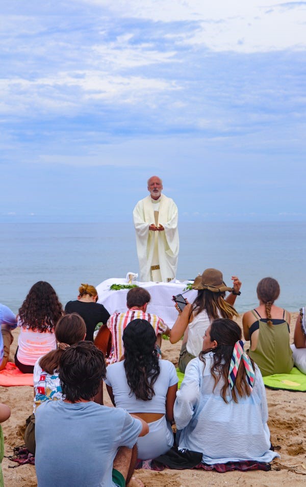 Cha. Jose Manglano dâng thánh lễ trên bãi biển với các thành viên của phong trào Hakuna. Ảnh của phong trào