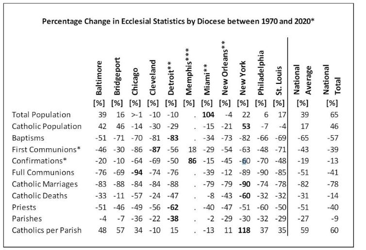 Một số phát hiện cấp quốc gia của báo cáo mới bao gồm tổng số giáo xứ trên toàn quốc đã giảm 9% từ năm 1970 đến năm 2020; trong cùng khoảng thời gian 50 năm đó, dân số nói chung đã tăng 65% và tổng dân số Công Giáo tăng 46%; từ năm 1970 đến năm 2020, tổng số linh mục trên toàn quốc đã giảm 40%, và về các bí tích trên toàn quốc, các lễ rửa tội giảm 57%; Hôn nhân Công Giáo giảm 78%; và tang lễ Công Giáo giảm 14 phần trăm.
