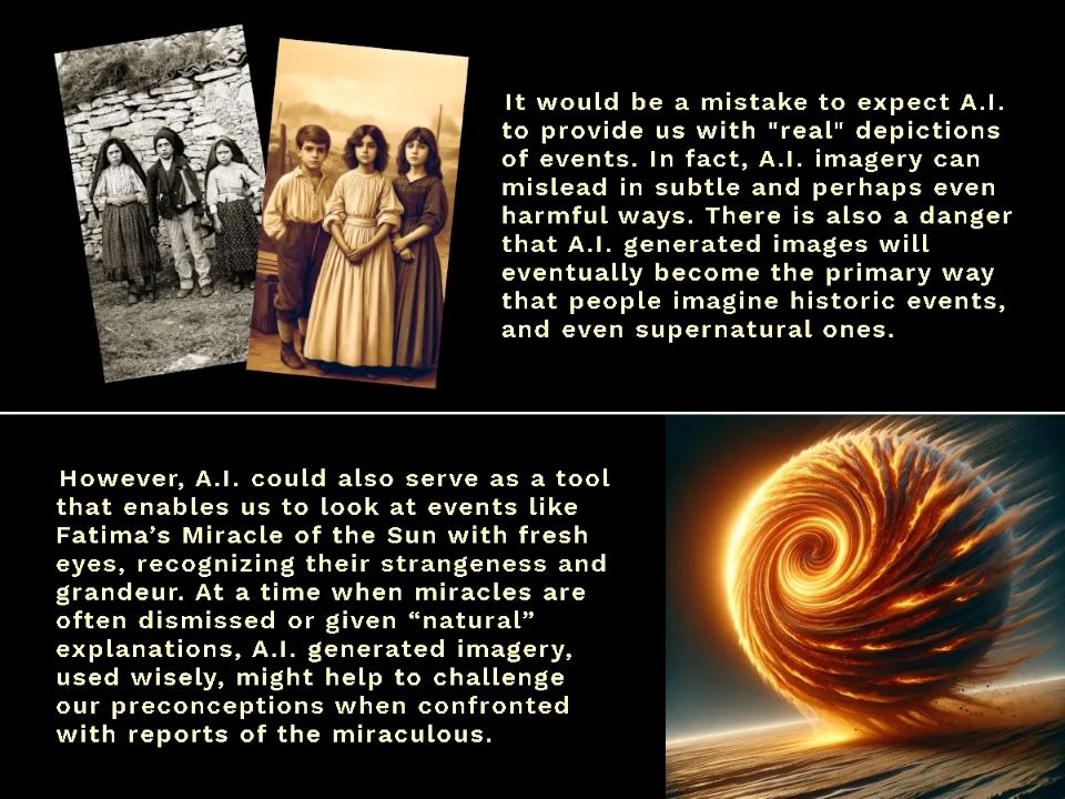 Tuy nhiên, điều đó ngay lập tức thay đổi khi tôi đối diện với các hình ảnh do trí khôn nhân tạo tạo ra. Chúng làm tôi ngạc nhiên. Nhìn thấy chúng khiến tôi hiểu rằng các nhân chứng đang cố gắng mô tả một điều gì đó hoàn toàn không thể xảy ra mà họ đã tận mắt nhìn thấy. Ngay cả khi những hình ảnh của trí khôn nhân tạo không phải là những mô tả chính xác về phép lạ (và không có cách nào để biết liệu chúng có đúng hay không), tuy nhiên chúng vẫn có thể truyền tải điều gì đó về sự kỳ lạ và sự hoành tráng của biến cố.