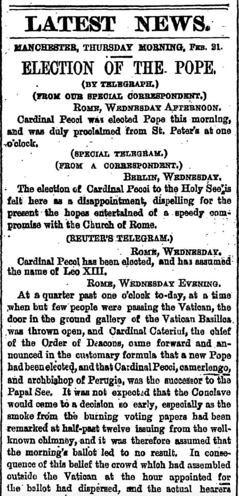 Độc giả cũng được thông báo rằng Giáo hoàng mới, người đã chọn Leo vì ngưỡng mộ Giáo hoàng Leo XII, là một "người có quan điểm ôn hòa về các vấn đề tôn giáo, mặc dù có lòng mộ đạo đáng nể, kết hợp với năng lượng và tính cách tuyệt vời..."