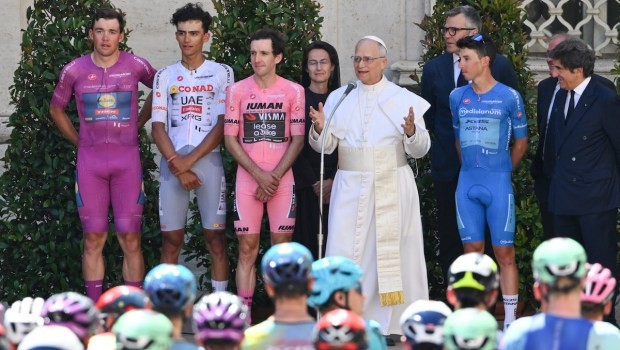 Trước khi phát biểu, Đức Leon XIV đã được tặng một chiếc áo màu hồng tượng trưng và chào đón những người mặc bốn chiếc áo đặc biệt: Simon Yates (áo màu hồng, người dẫn đầu chung cuộc), Mads Pedersen (áo hoa anh thảo, phân loại điểm), Lorenzo Fortunato (áo màu xanh, người leo núi giỏi nhất) và Isaac Del Toro (áo màu trắng, tay đua trẻ giỏi nhất). Ngài cũng đã có một cuộc trò chuyện ngắn với tay đua người Colombia Nairo Quintana, người đã giành chiến thắng trong cuộc đua năm 2014.