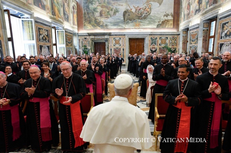 Tôi rất vui khi được ở đây với anh chị em, những người đã cống hiến một việc phục vụ quý giá cho đời sống của Giáo hội bằng cách giúp thực hiện sứ mệnh được giao phó cho tôi. Thật vậy, như Tông hiến Praedicate Evangelium khẳng định, Phủ Quốc vụ khanh, với tư cách là Phủ Quốc vụ khanh Giáo hoàng do Quốc vụ khanh chỉ đạo, hỗ trợ chặt chẽ cho Giám mục Rôma trong việc thực hiện sứ mệnh tối cao của ngài” (xem các số 44-45).