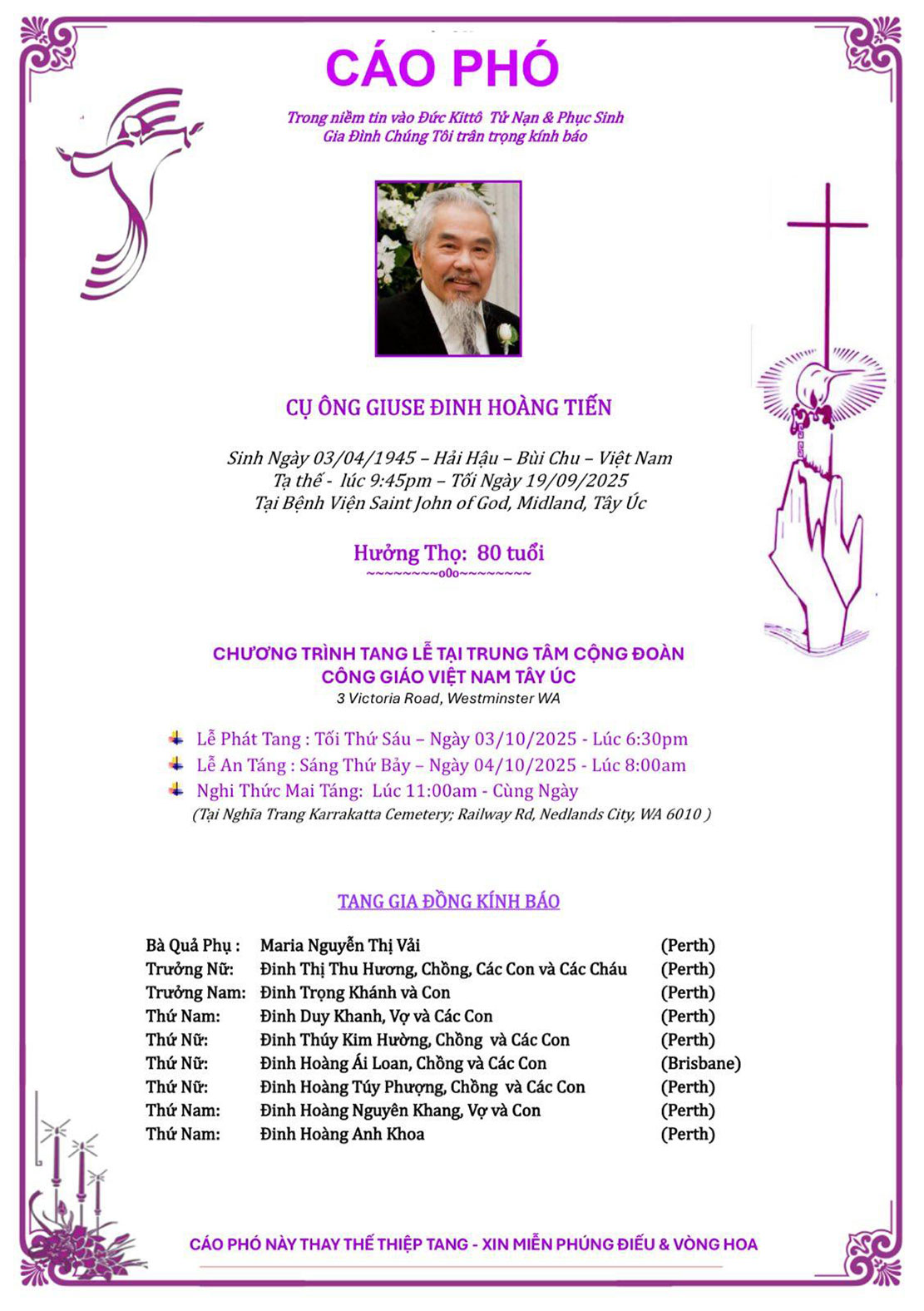 Cáo phó Cụ Giuse Đinh Hoàng Tiến, bào huynh của xướng ngôn viên Thúy Hồng, thân phụ của cộng tác viên Thu Hương