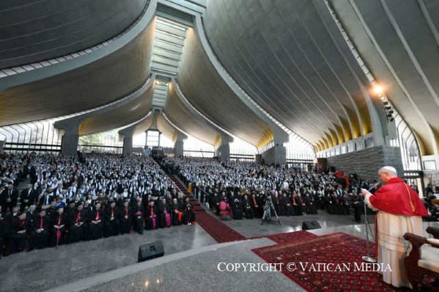 Tôi rất vui mừng được gặp gỡ anh chị em trong chuyến tông du này, với khẩu hiệu “Phúc cho những ai xây dựng hòa bình” (Mt 5:9). Giáo hội tại Lebanon, hiệp nhất trong nhiều khía cạnh khác nhau, là hình ảnh của những lời này, như Thánh Gioan Phaolô II đã khẳng định với lòng trìu mến sâu sắc dành cho dân tộc của anh chị em: “Tại Lebanon ngày nay,” ngài nói, “anh em là những người mang lại hy vọng” (Sứ điệp gửi người dân Lebanon, ngày 1 tháng 5 năm 1984); và ngài nói thêm, “Hãy tạo ra, nơi anh chị em sống và làm việc, một bầu không khí huynh đệ. Không cần phải ngây thơ, xin anh chị em biết cách trao niềm tin cho người khác và sáng tạo để sức mạnh tái sinh của lòng tha thứ và lòng thương xót có thể chiến thắng” (ibid.).